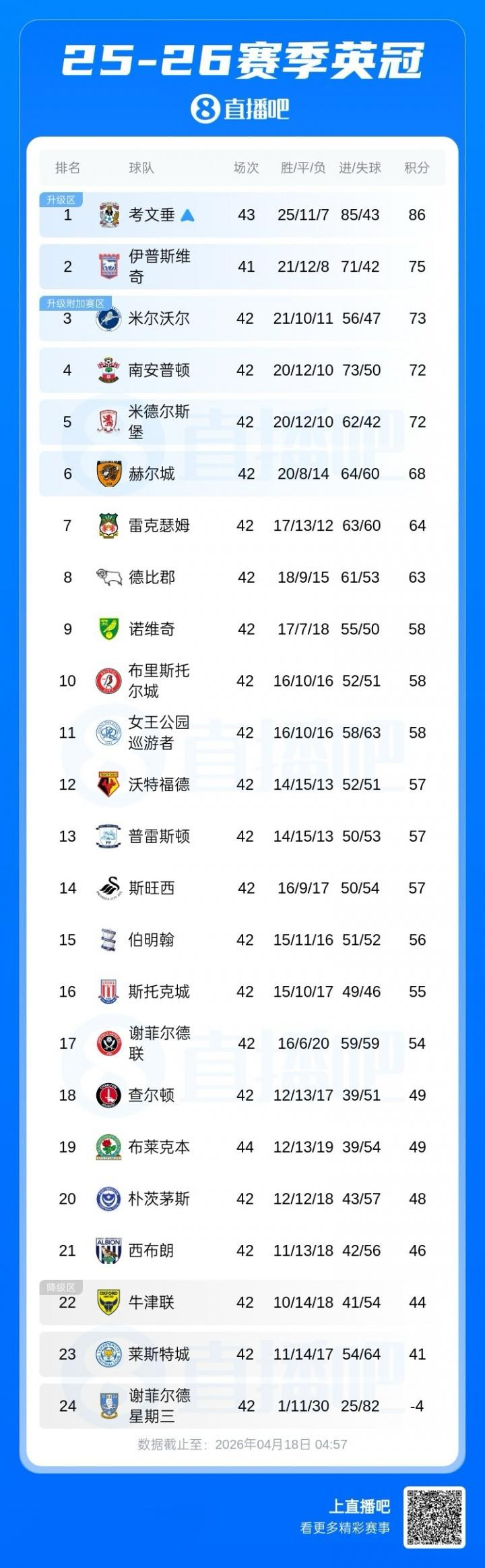 直播吧04月18日讯英冠第43轮,考文垂客场1-1布莱克本,球队提前3轮锁定英冠前两名,成功获得下赛季英超参赛资格,时隔25年重返英超。